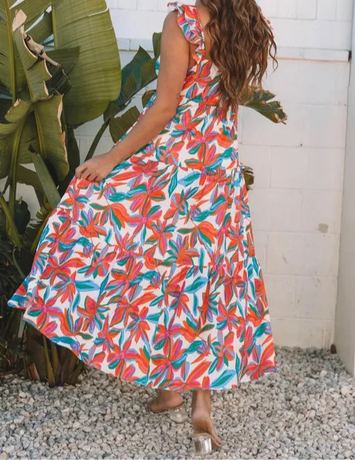 Red Boho Floral Ruffled Strap V Neck Maxi Dress
