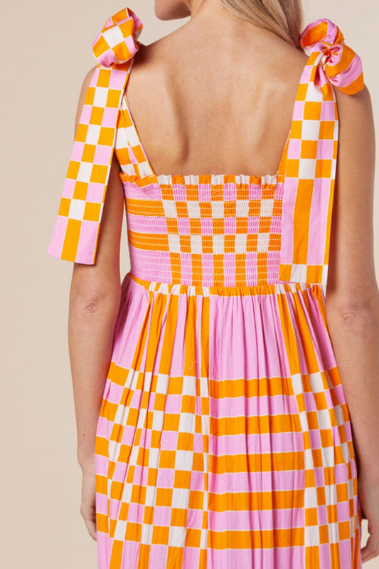 Boho Gingham Tied Straps Smocked Maxi Dress