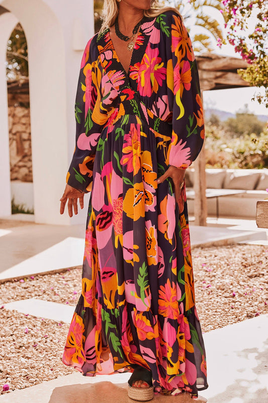 Floral Print Smocked Detail V Neck Puff Sleeve Flowy Maxi Dress
