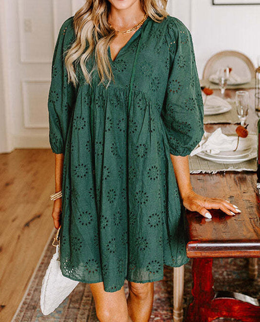 Embroidered Eyelet Pattern 3/4 Puffy Sleeve Swing Mini Dress