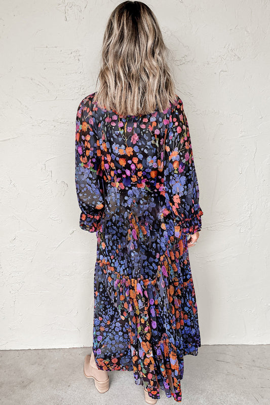 Tassel Tie V Neck Long Sleeve Flowy Long Dress