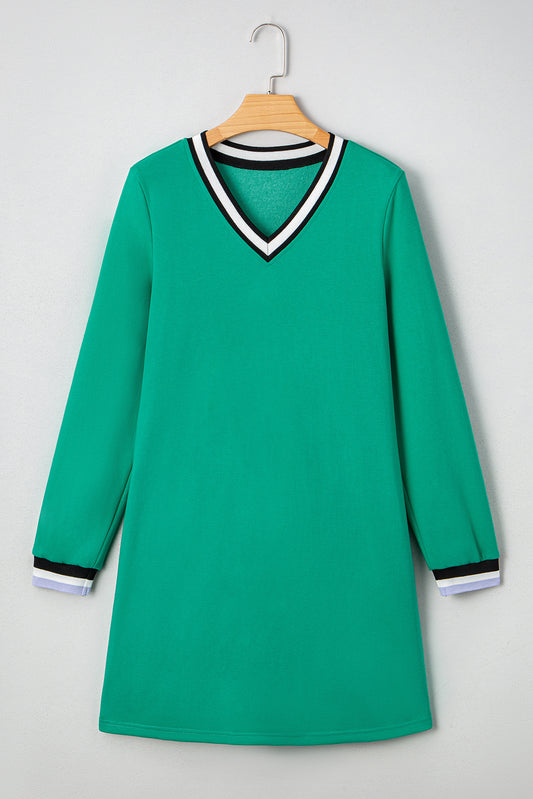 Varsity Contrast Striped V Neck Long Sleeve T Shirt Dress with Pockets