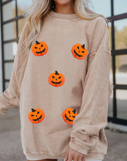 Twisted Rib Texture Chenille Halloween Pumpkin Patched Drop Shoulder Sweatshirt