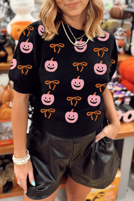 Short Puff Sleeve Bow Knot Plush Skeleton Halloween Sweater