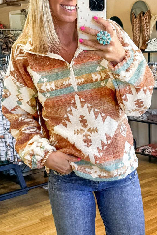 Quarter Zip Elastic Cuffs Aztec Sweatshirt