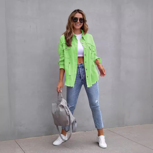 Lapel Distressed Raw Hem Buttons Denim Jacket
