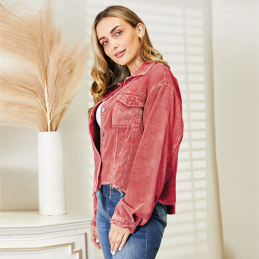 Ruffle Raw Hem Flap Pockets Denim Jacket
