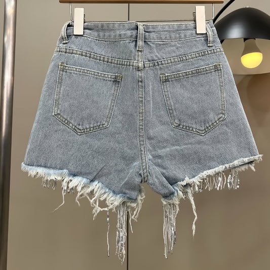 Fringed Rhinestone High-rise Denim Shorts