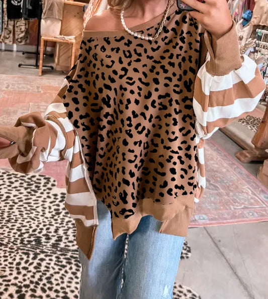 Block Patchwork Leopard Casual Sweatshirt with Slits