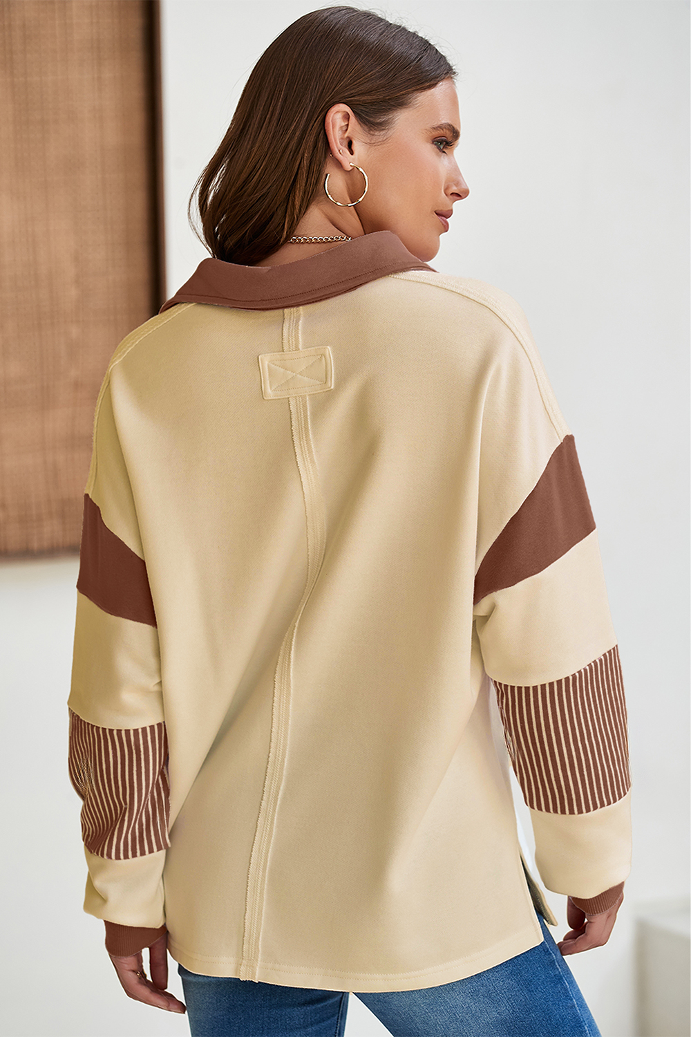 Block Striped Patchwork Sequin Rugby Graphic Polo Sweatshirt