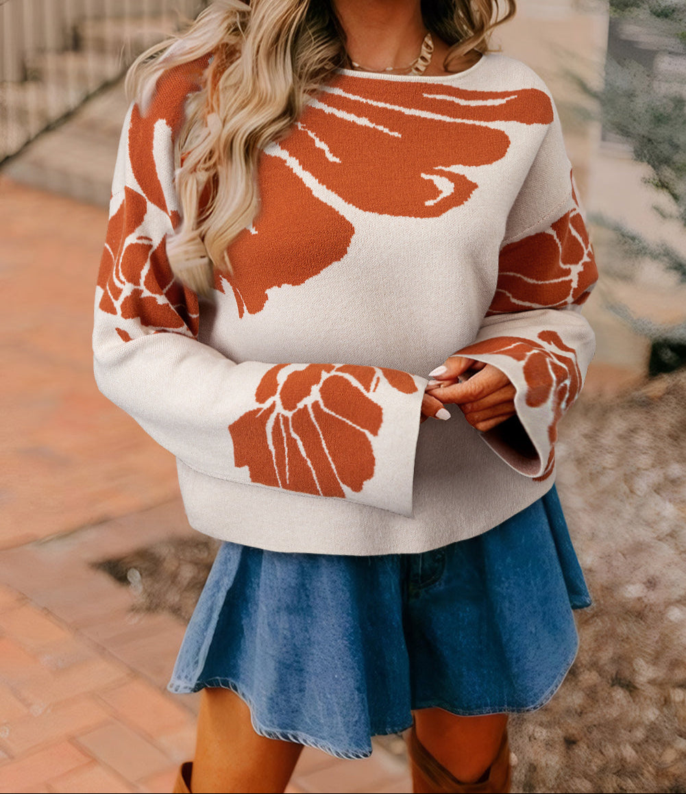 Bold Flower Pattern Wide Sleeve Baggy Sweater