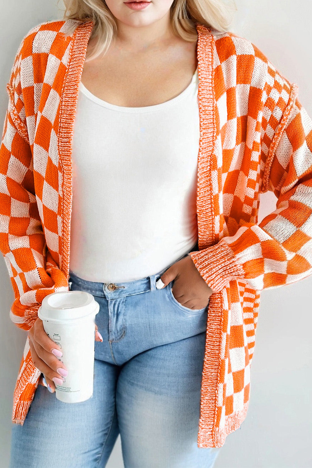 Checkered Bubble Sleeve Drop Shoulder Open Cardigan