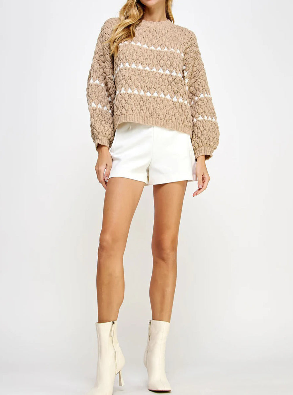 Contrast Detail Textured Knit Puff Sleeve Baggy Sweater