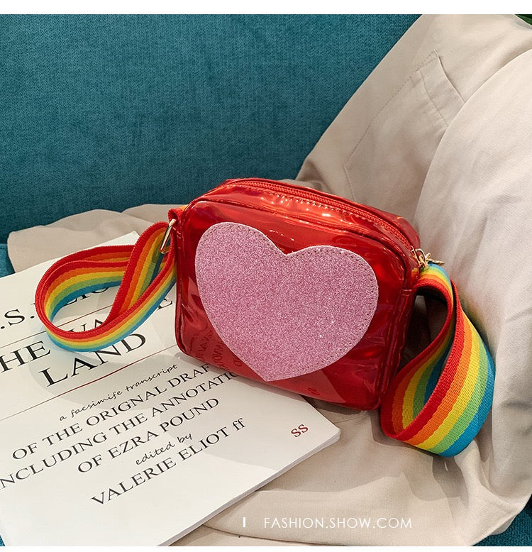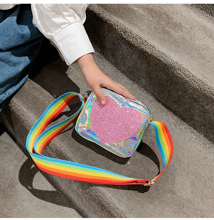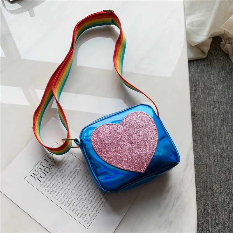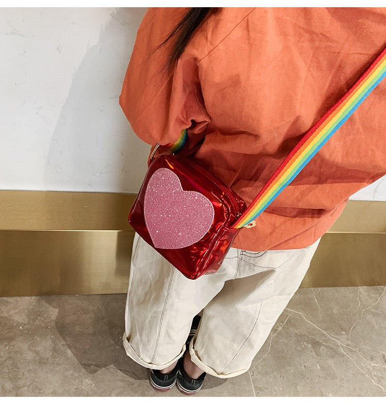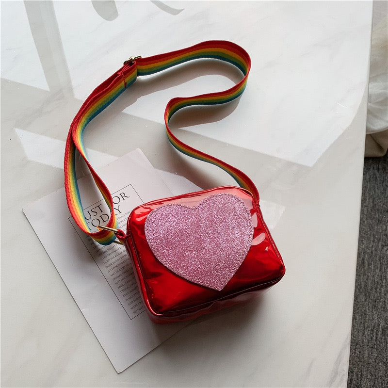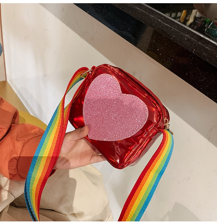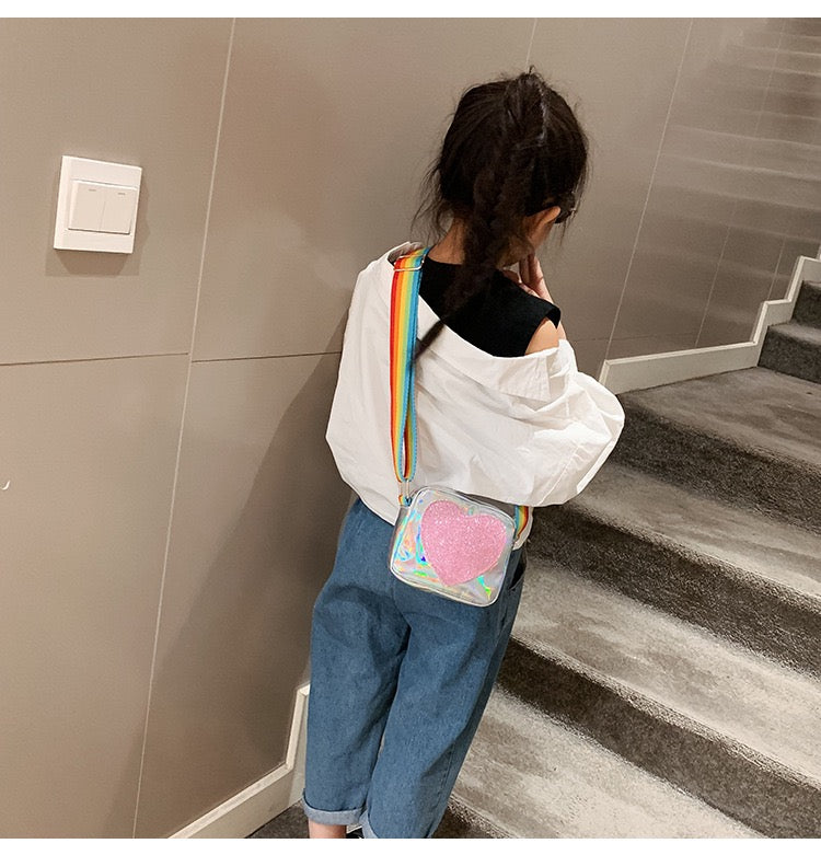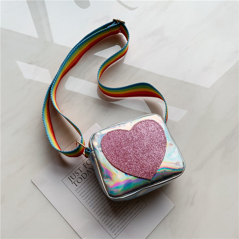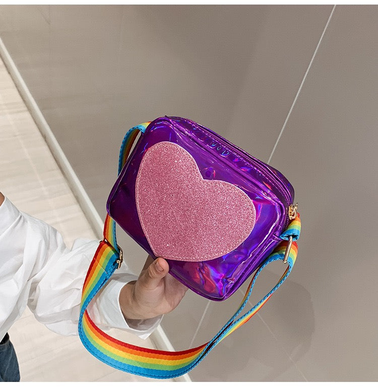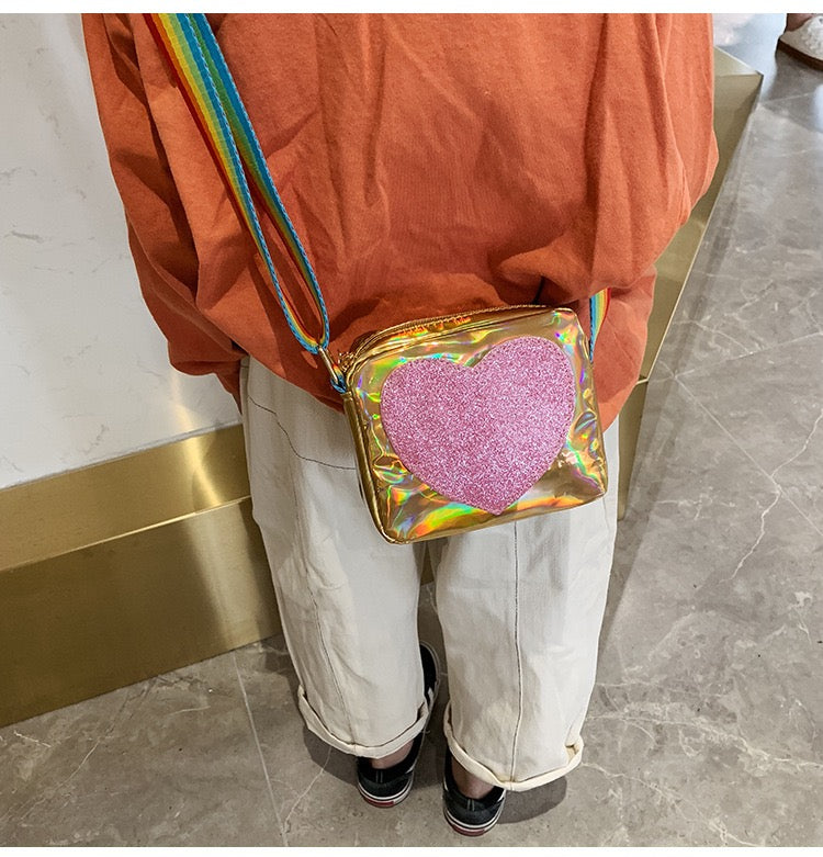 No look is complete for the Little Fashionista without the perfect purse!  This metallic purse/crossbody is detailed with a glitter heart and adjustable rainbow strap.