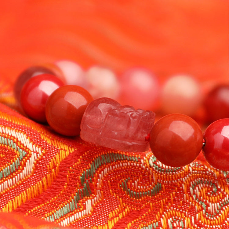 • Fire: Red Agate, Sunstone, Yanyuan Agate, Red Hematoid Quartz, Rhodonite, Dragon Vein Agate, Strawberry Quartz, Emperor Cinnabar, South Red Agate, Strawberry Quartz (Pixiu)