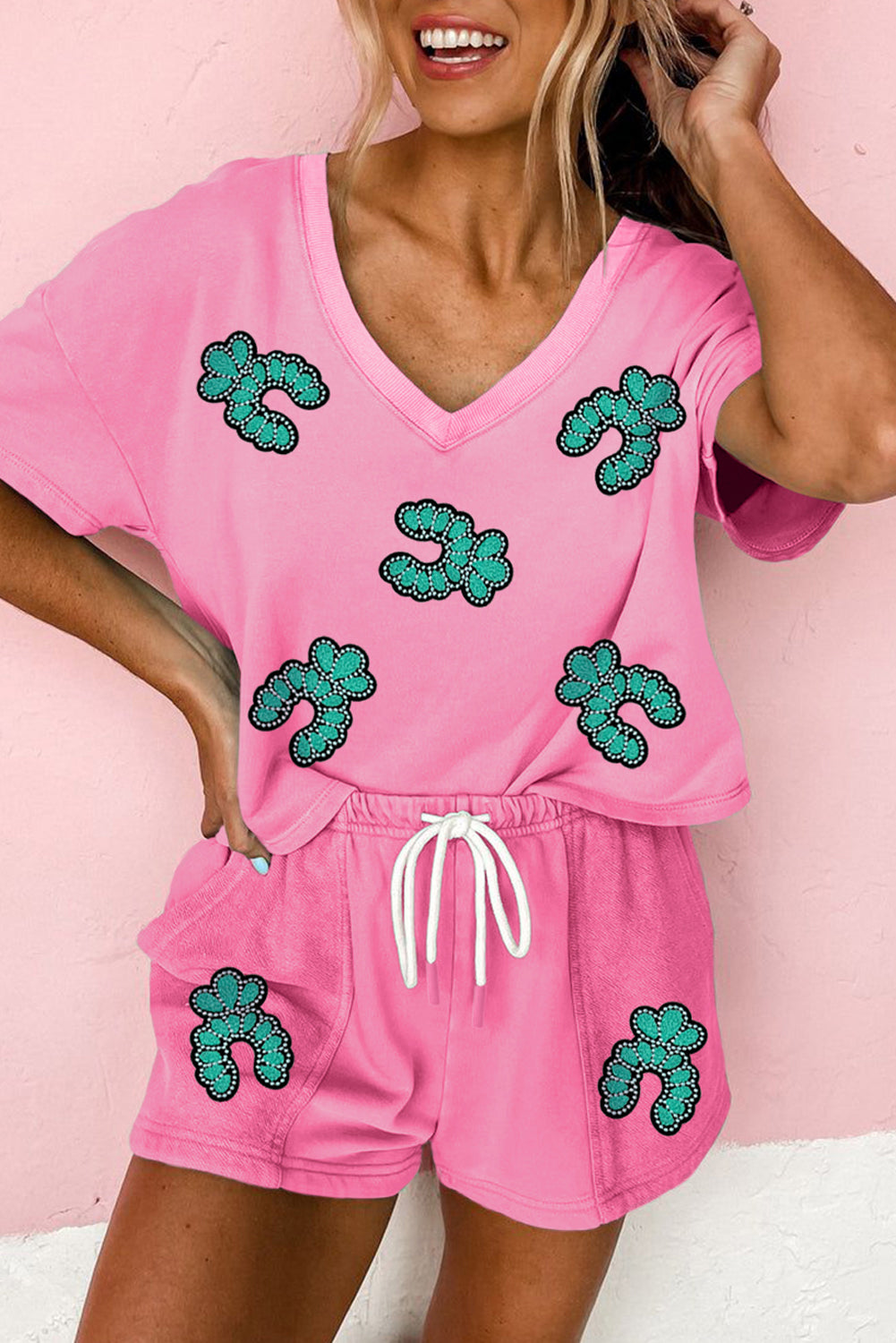 Sequin Turquoise Patched V Neck Tee Drawstring Shorts 2pcs Outfit