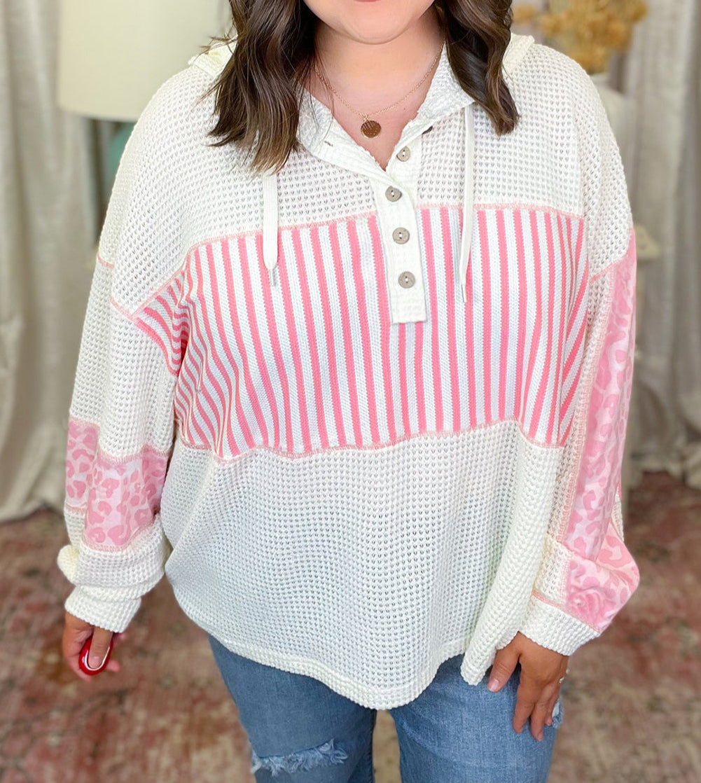 Stripe Leopard Patchwork Waffle Knit Buttoned Plus Size Hoodie