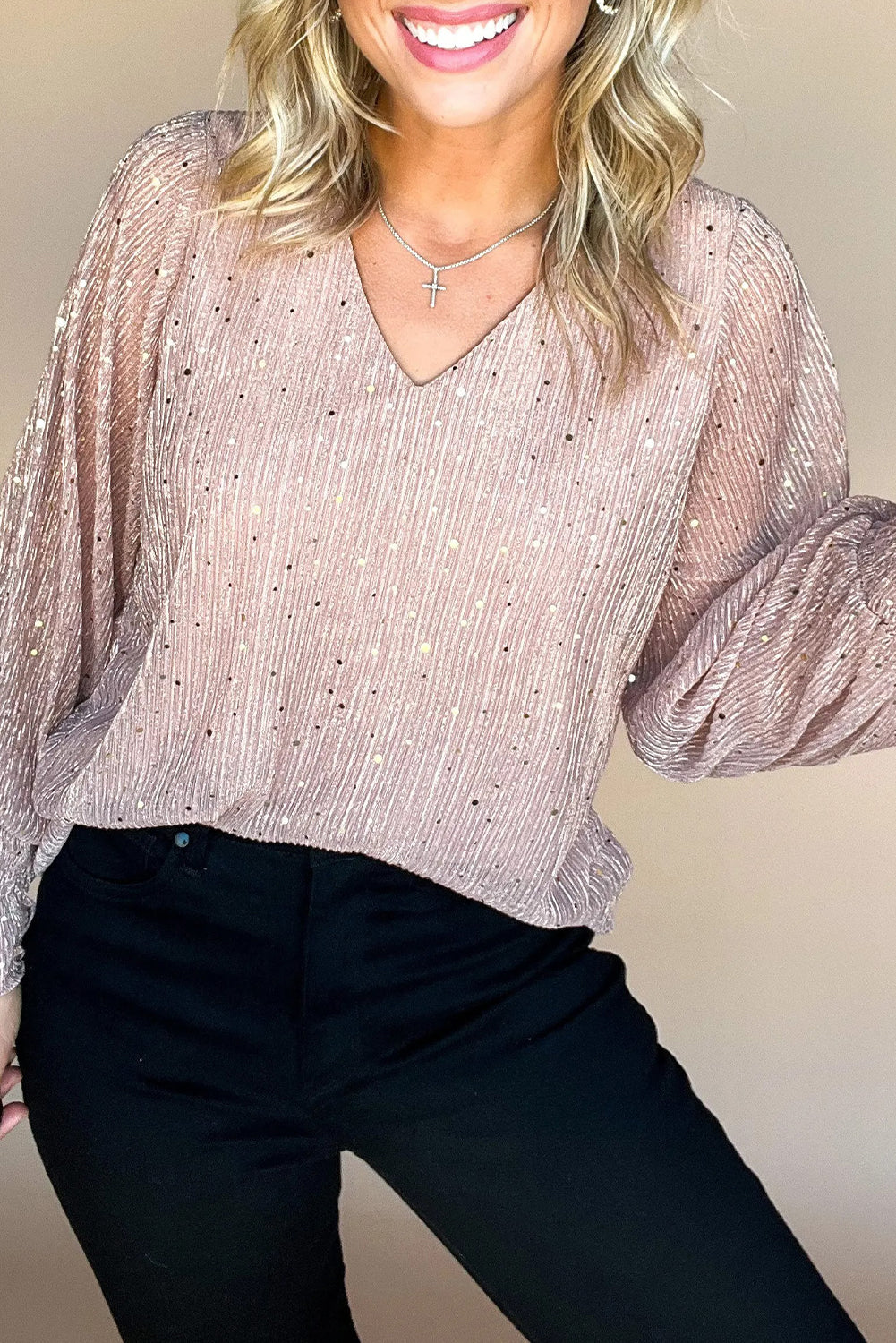 V Neck Sequin Plisse Long Sleeve Blouse
